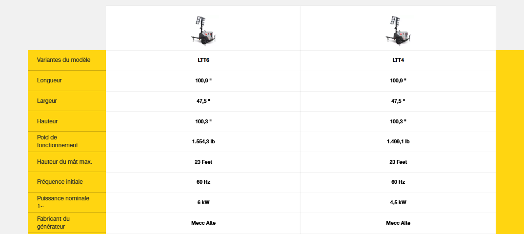 Les tours d’éclairage LTT4 et LTT6 offrent un encombrement réduit et les LED à longue durée de vie fournissent une couverture lumineuse exceptionnelle pour une variété d’applications où un éclairage temporaire est nécessaire. Les unités sont équipées d’une alimentation auxiliaire qui ajoute à la polyvalence de ces machines.